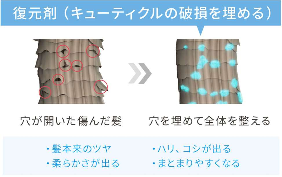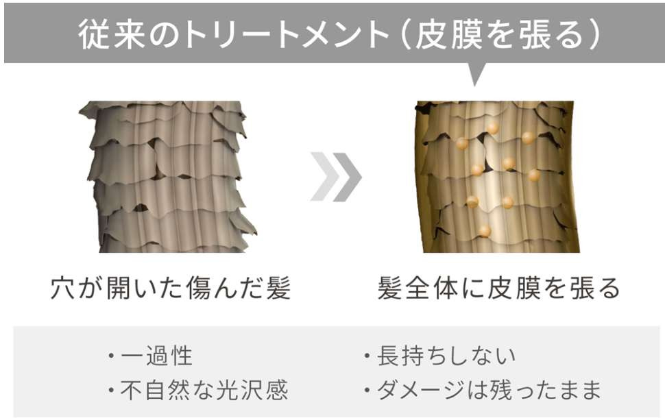 一般的なヘアケアによる補修と違うのは、キューティクルの破損部分をコーティングで覆い隠すのではなく、元の状態に模倣し修復していき、本来の健康な状態に近づけることです。